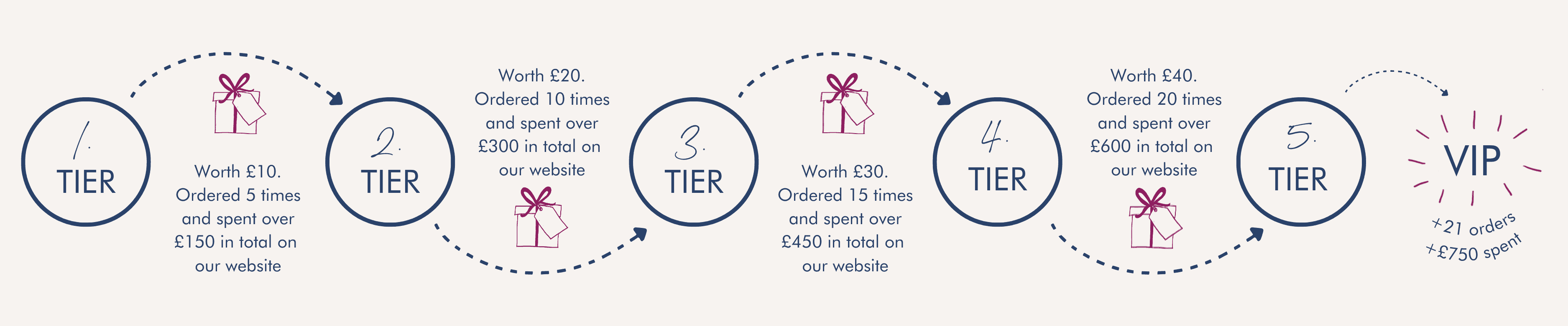 Customers are automatically opted into our programme if they are subscribed to our mailing list and make a qualifying purchase. There is no time limit to reach these tiers (your status does not reset after a year). We feel this would be unfair and you deserve a lot more from us, as our loyal customer.