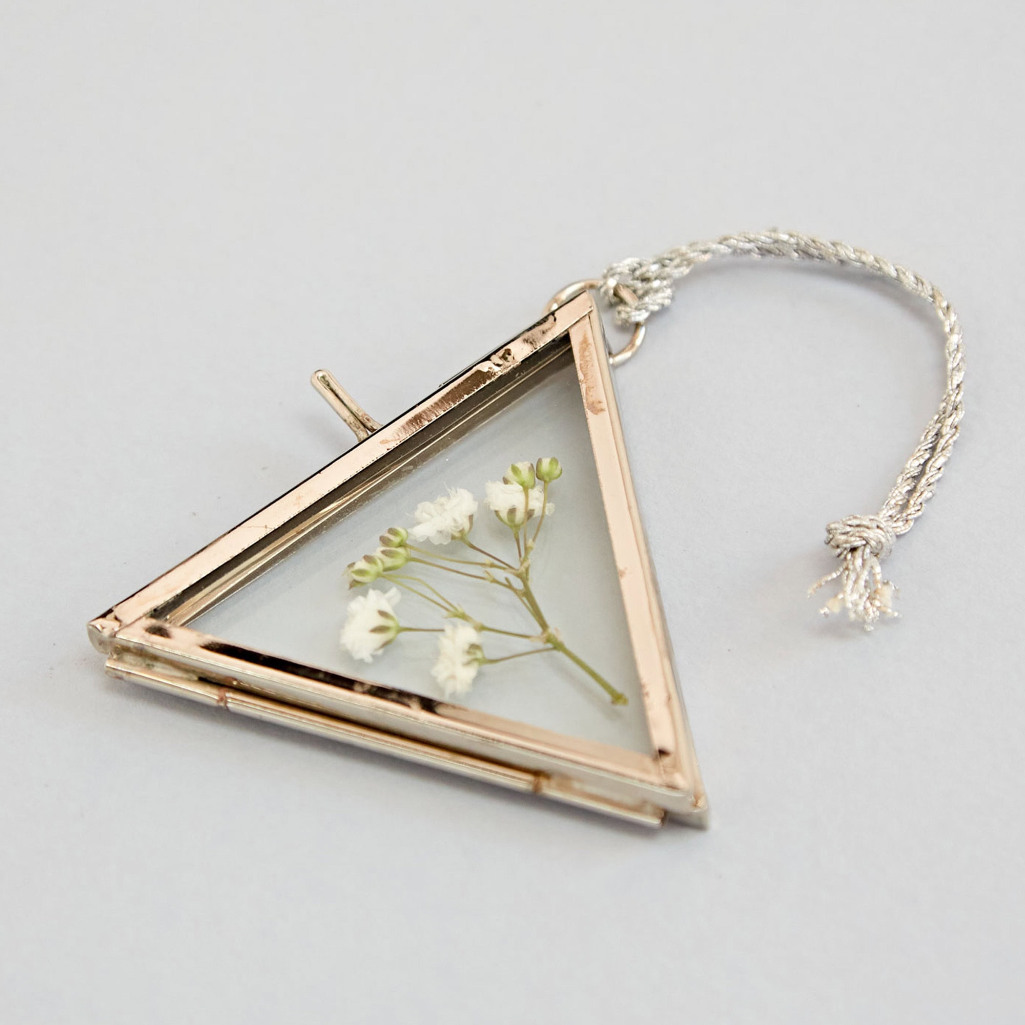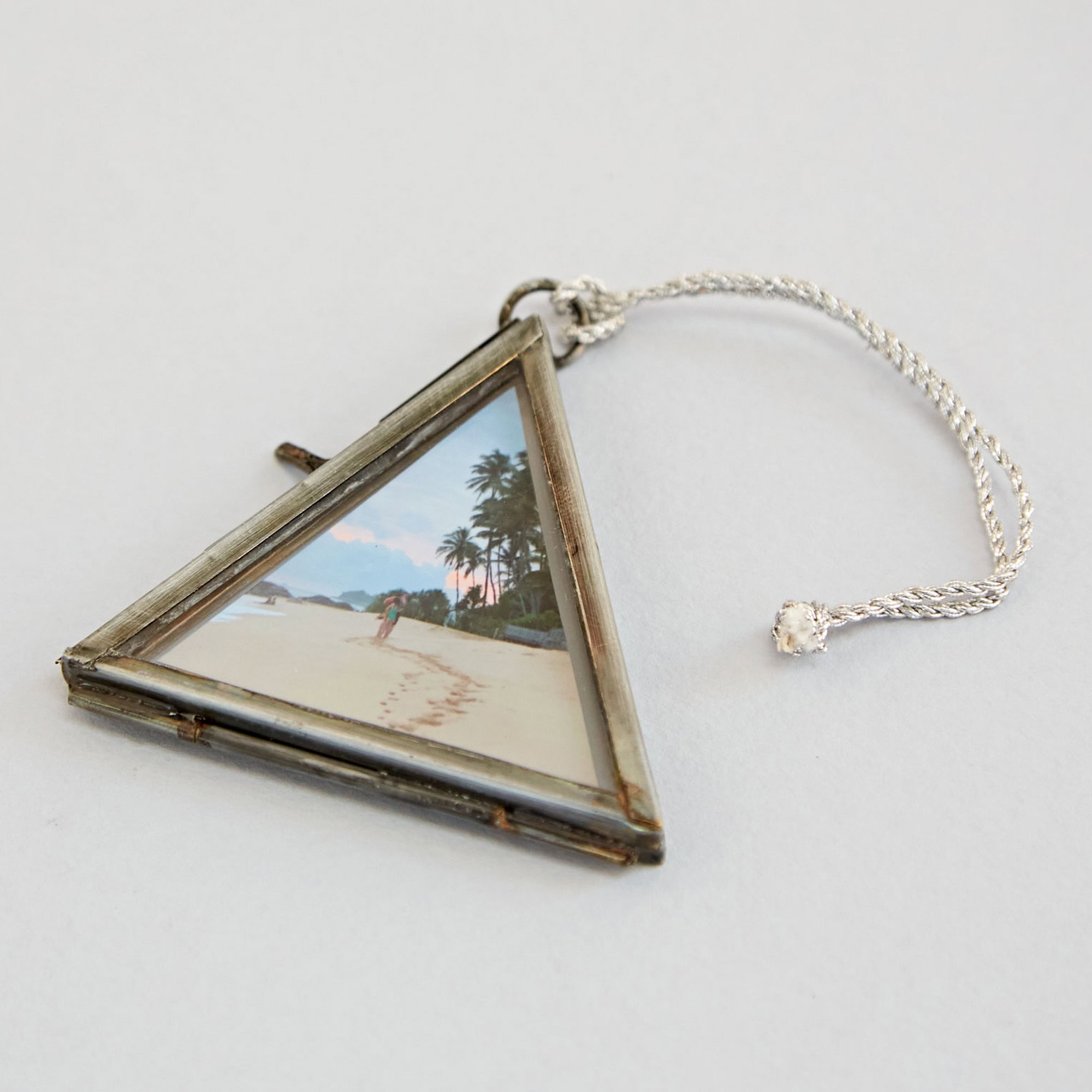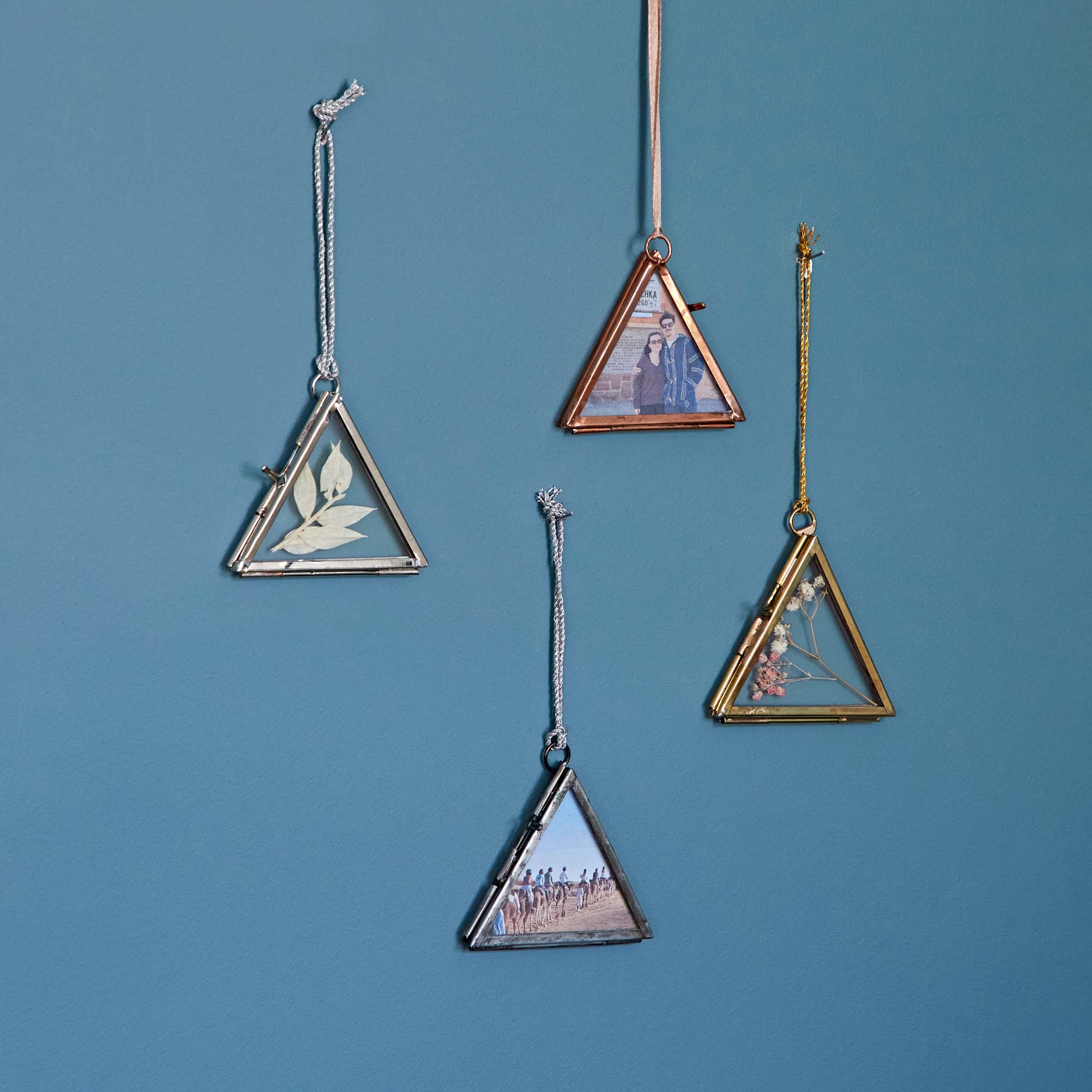 Add a touch of geometric charm to your décor with this mini triangular glass hanging photo frame. Beautifully handcrafted from recycled glass with a metal surround, this petite frame combines contemporary shape with timeless craftsmanship, making it a striking yet subtle way to display your favourite keepsakes.