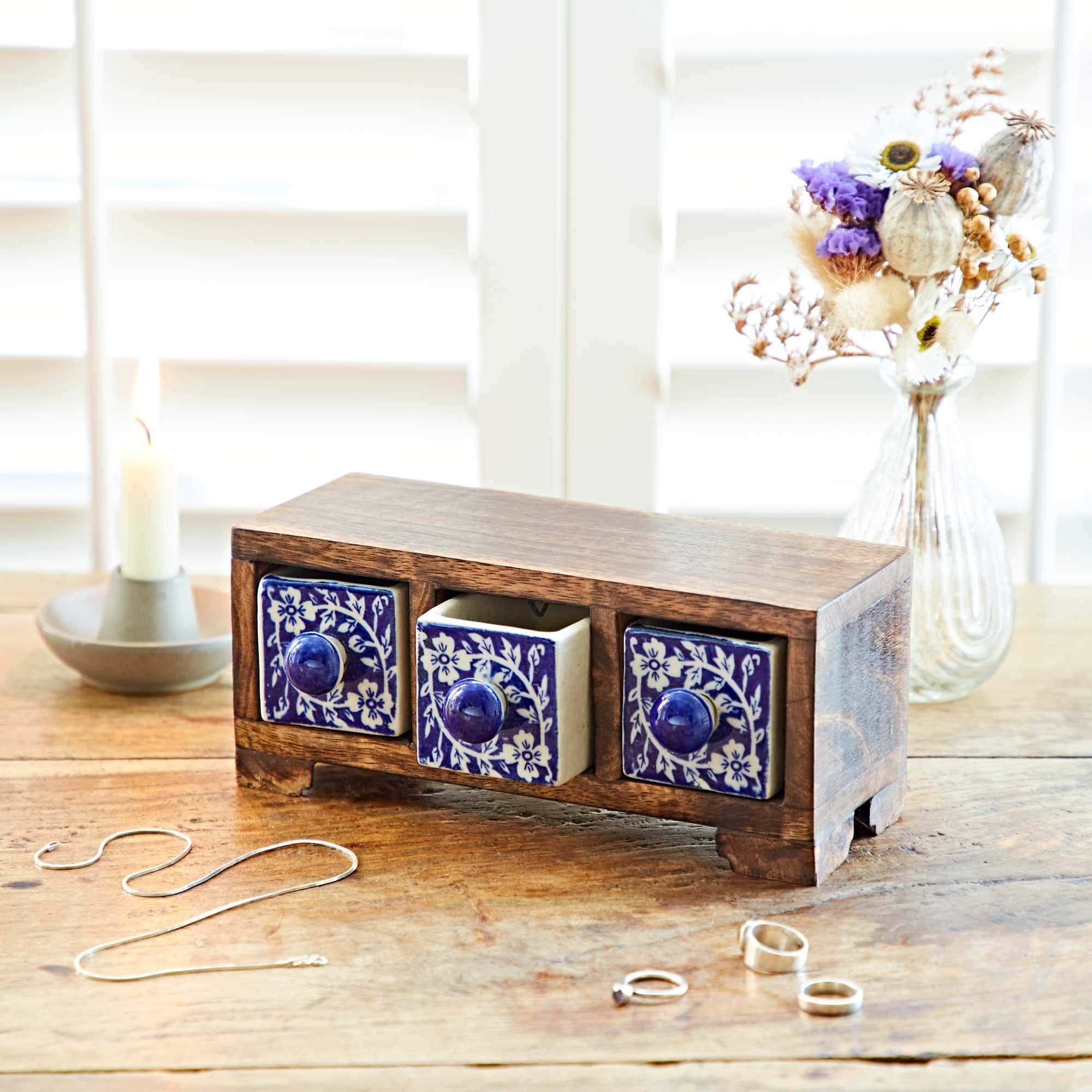 All our mango wood products are made entirely by hand using traditional skills handed down from one generation to the next. Mango trees have an incredibly long life, but eventually stop bearing fruit and are replaced by younger trees. As India produces, by far, the most mangos in the world, this results in a huge industry using one of the most sustainable woods known to man. The drawers are made from ceramic, finished with a unique hand painted design.