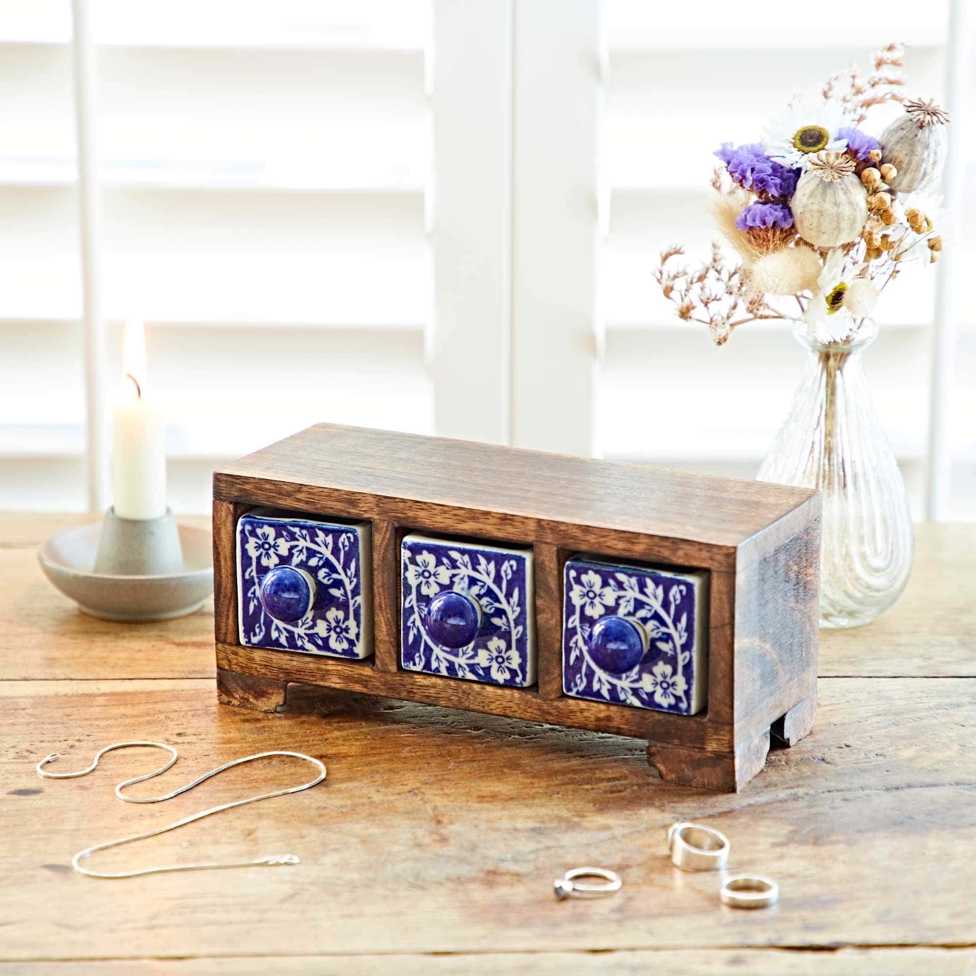 Ideal for keeping jewellery, trinkets, sewing supplies, or other little essentials neatly organised, this blue floral ceramic 3 drawer chest combines functionality with artistry. The hand-painted designs make every piece unique, with subtle variations in the floral patterns and brushstrokes highlighting the craftsmanship behind each one. Its compact size makes it versatile enough to sit on a bedside table, dressing table, desk, or shelf, adding both storage and beauty to your space.