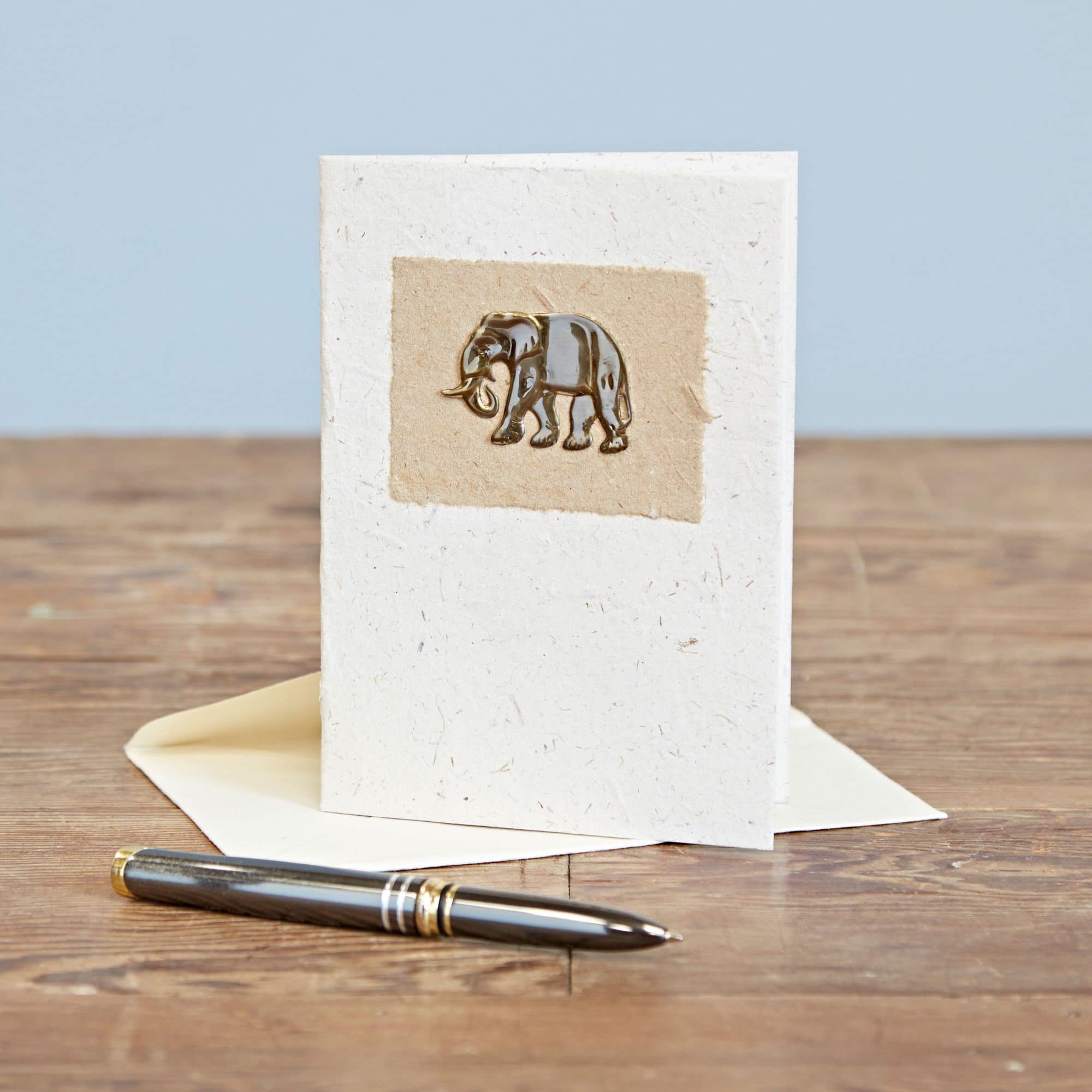Each elephant dung blank greeting card is finished with a brass elephant on the front. As each one is crafted by hand, the design may be slightly different to the one pictured. The inside of the card is blank, to be used for any occasion.