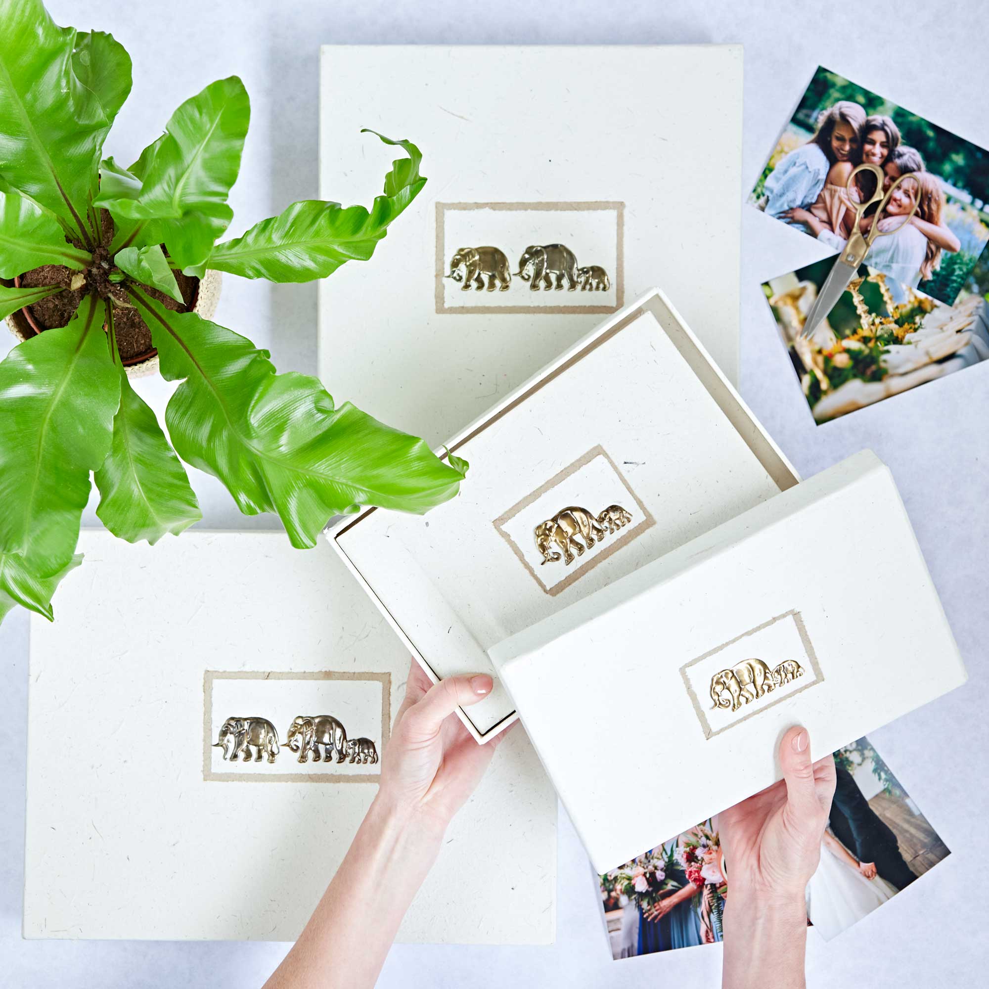 Enclosed in a matching gift box, these beautiful elephant dung photo albums are as charming as they are quirky. Each one is filled with 35 pages of handmade paddy husk paper, acid-free and interleaved with tissue paper to protect and preserve your memories.