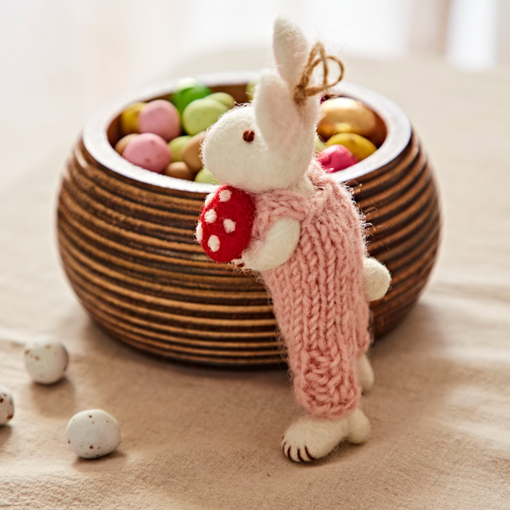 Bring a touch of woodland magic into your home with this enchanting felt rabbit with mushroom hanging decoration. Dressed in cosy pink knitted dungarees, the bunny holds a vibrant red mushroom with white spots – a sweet reminder of forest foraging and nature’s little treasures. With its gentle details and playful character, it’s a piece that captures both charm and imagination.