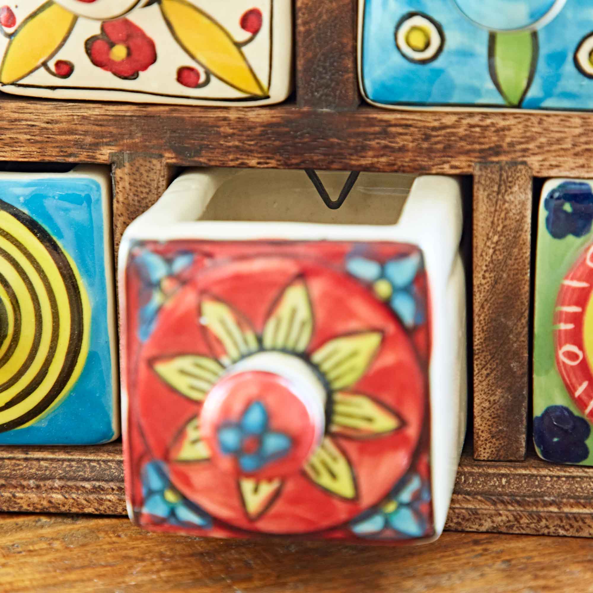 Keep your trinkets, spices, teas, dried herbs, jewellery or haberdashery organised in our multifunctional hand painted Indian multicoloured ceramic 6 drawer pyramid chest. Made from solid mango wood, our chest features handy clips to keep the drawers in place when in use.