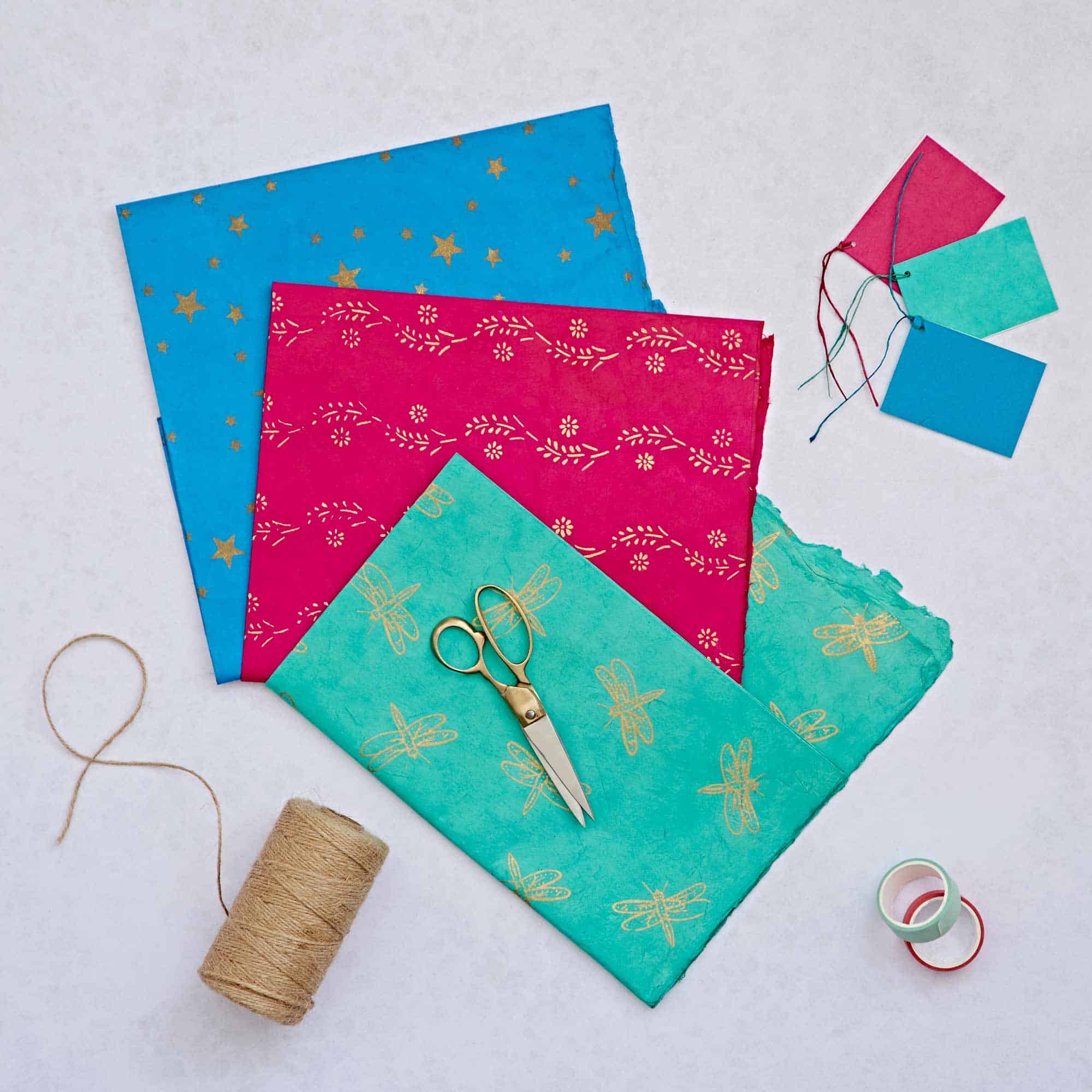 Our stunning pack of 3 lokta paper gift wrap is handmade from Lokta, a shrub that grows in the foothills of the Himalayas. After being harvested, it is boiled, cleaned, and beaten with wooden mallets to produce a fibre pulp. It is then mixed with water and poured into a shallow frame made of bamboo poles and canvas, before it is dried in the sun. Finally details are added to the paper by the skilled artisans, creating the beautiful, acid-free paper.