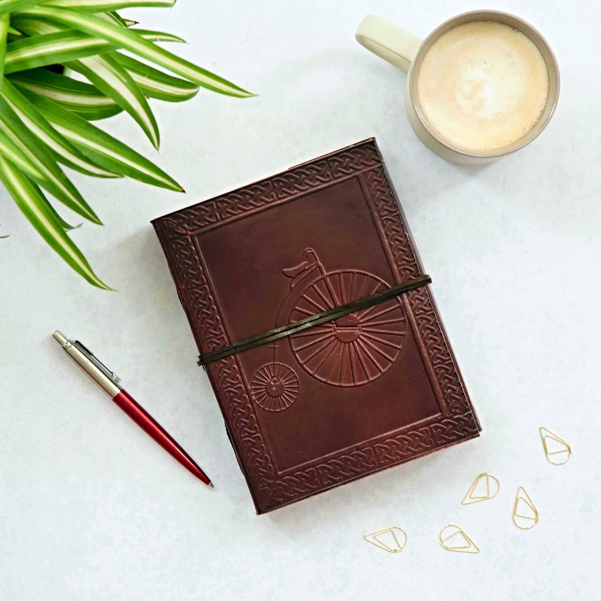 Our beautiful penny farthing leather journals are perfect for use as a diary, travel journal, or scrapbook. A British made bicycle, the penny-farthing is a symbol of the innovation in the late Victorian era. Each journal is crafted by hand and contains pages of unlined, handmade khadda paper.