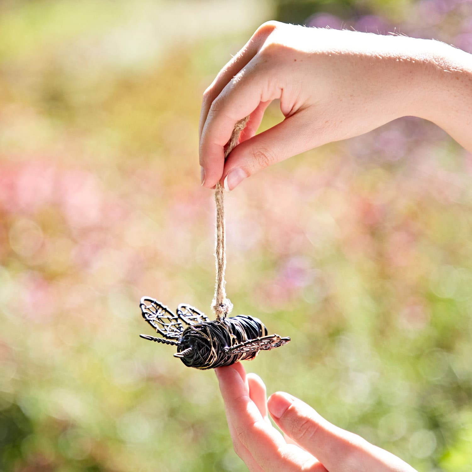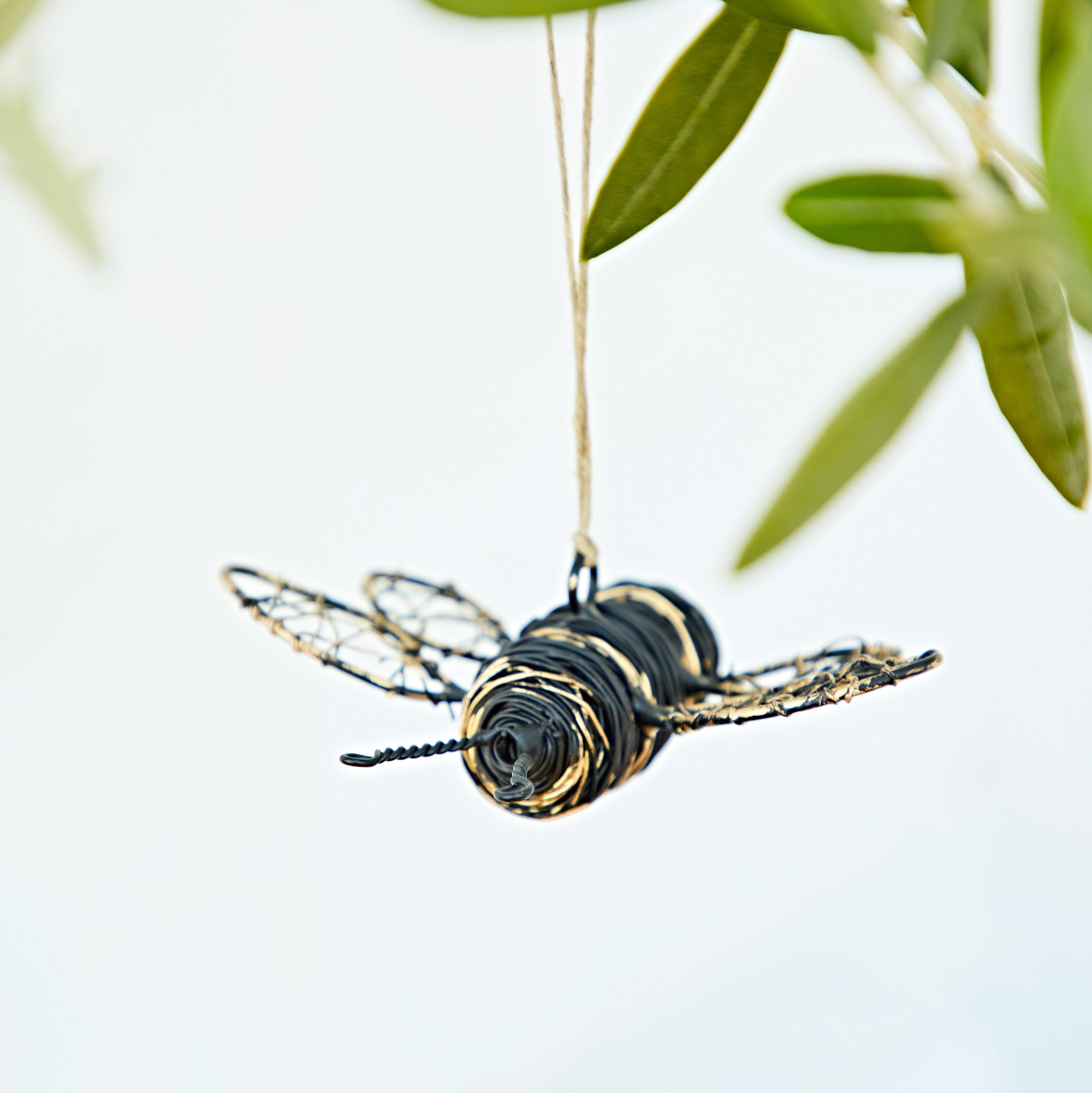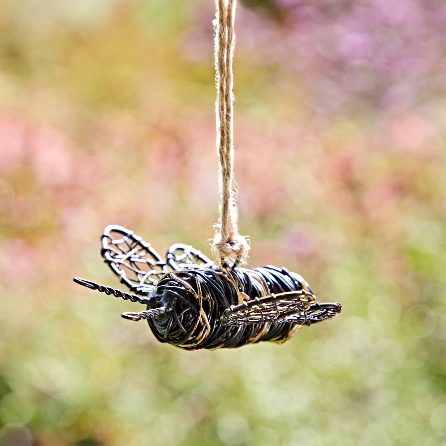 This delightful hanging bee garden ornament adds a contemporary and nature-inspired touch of beauty to your home or garden. It is carefully handcrafted from durable metal wire, ensuring long-lasting quality, and can be easily hung from the attached jute string.