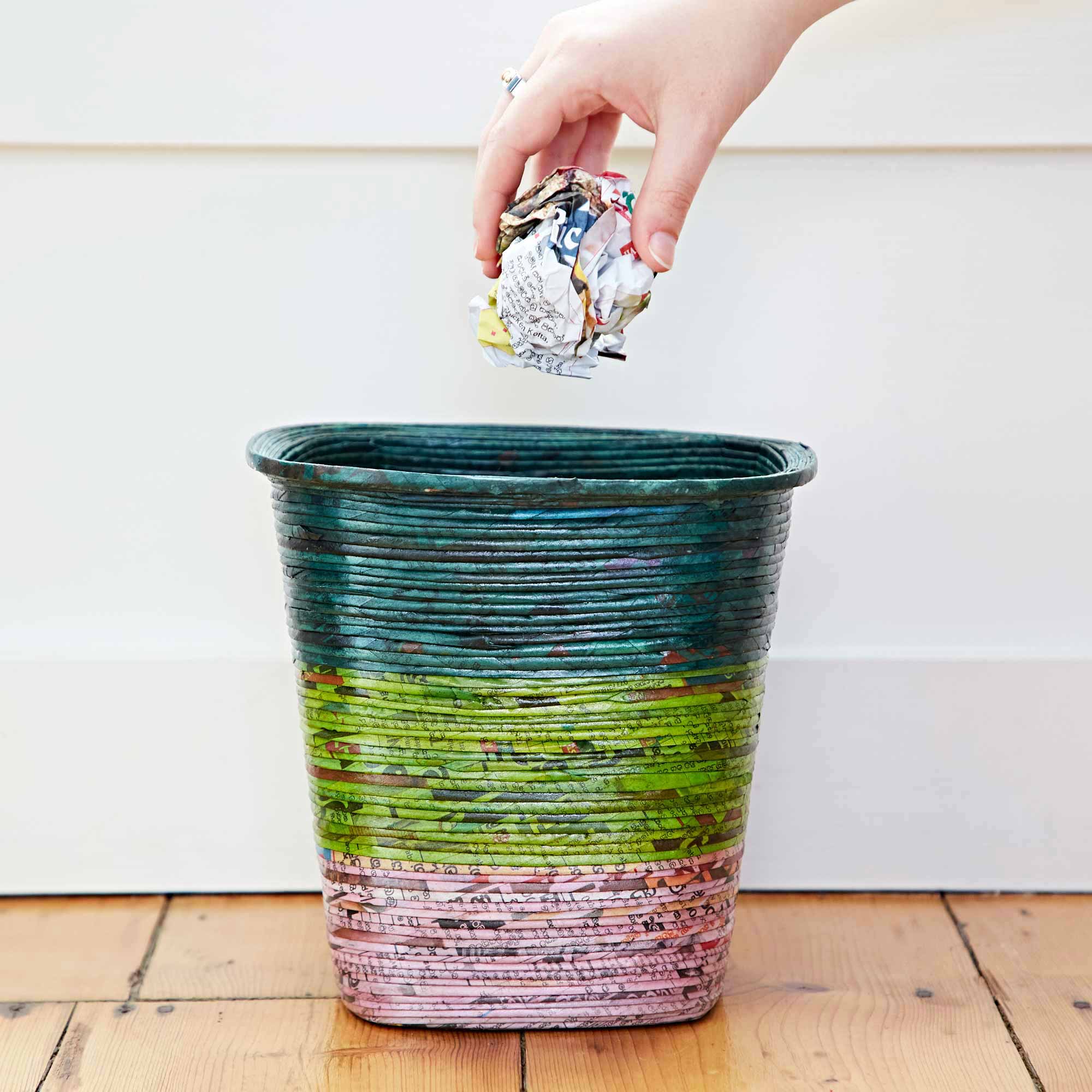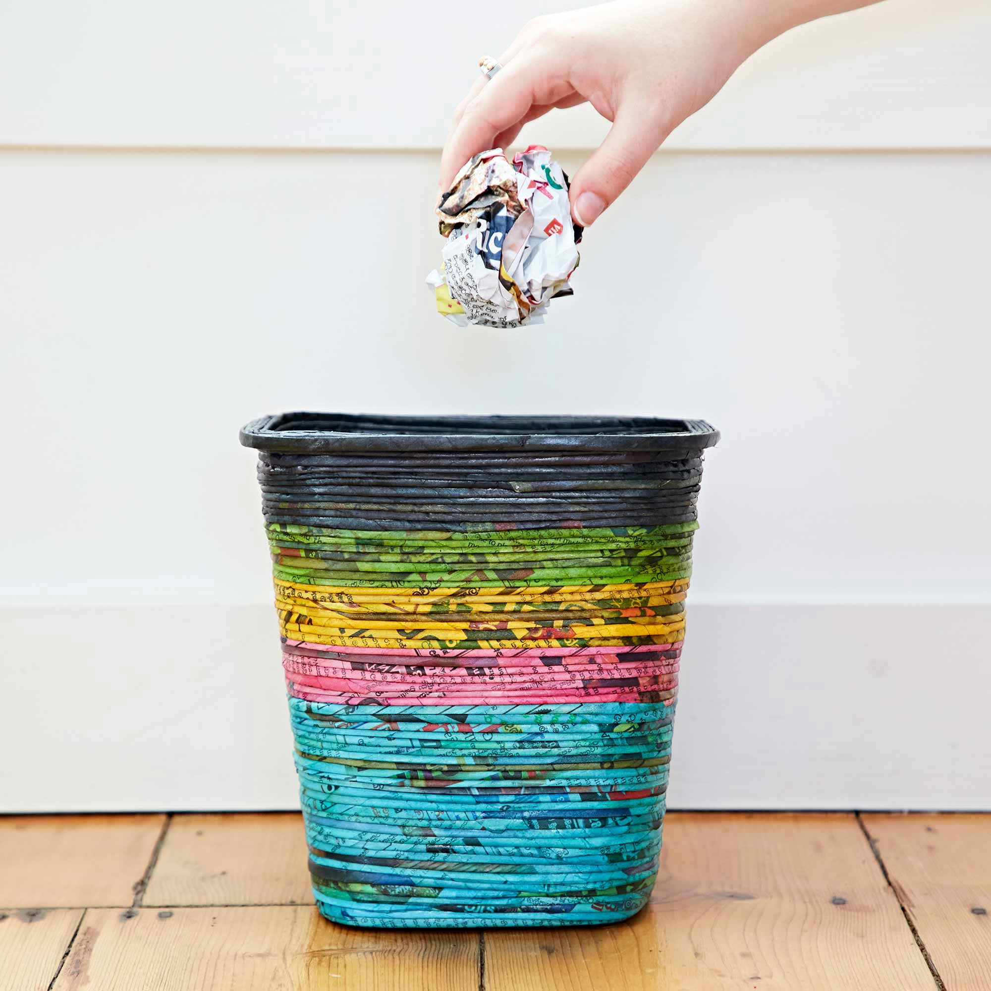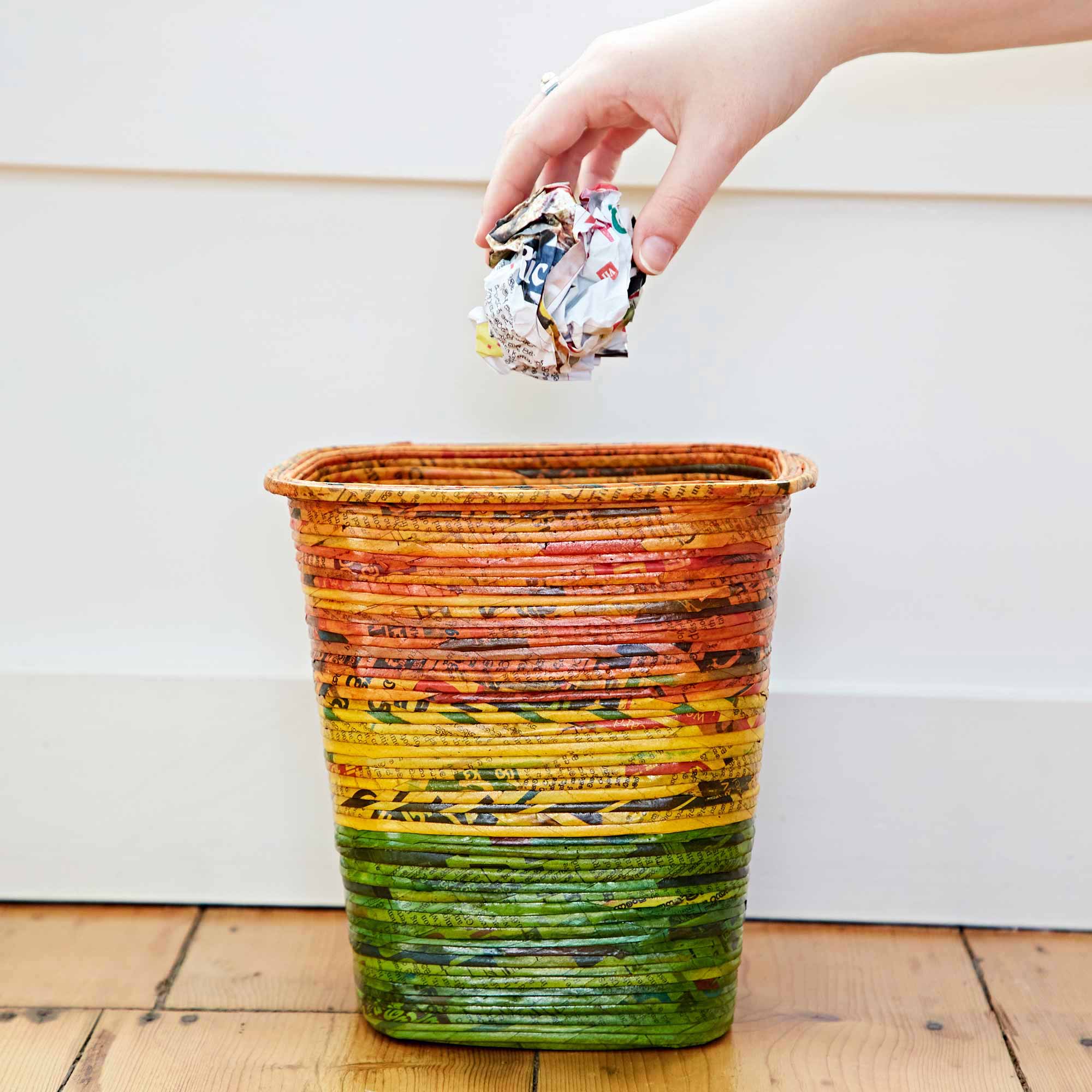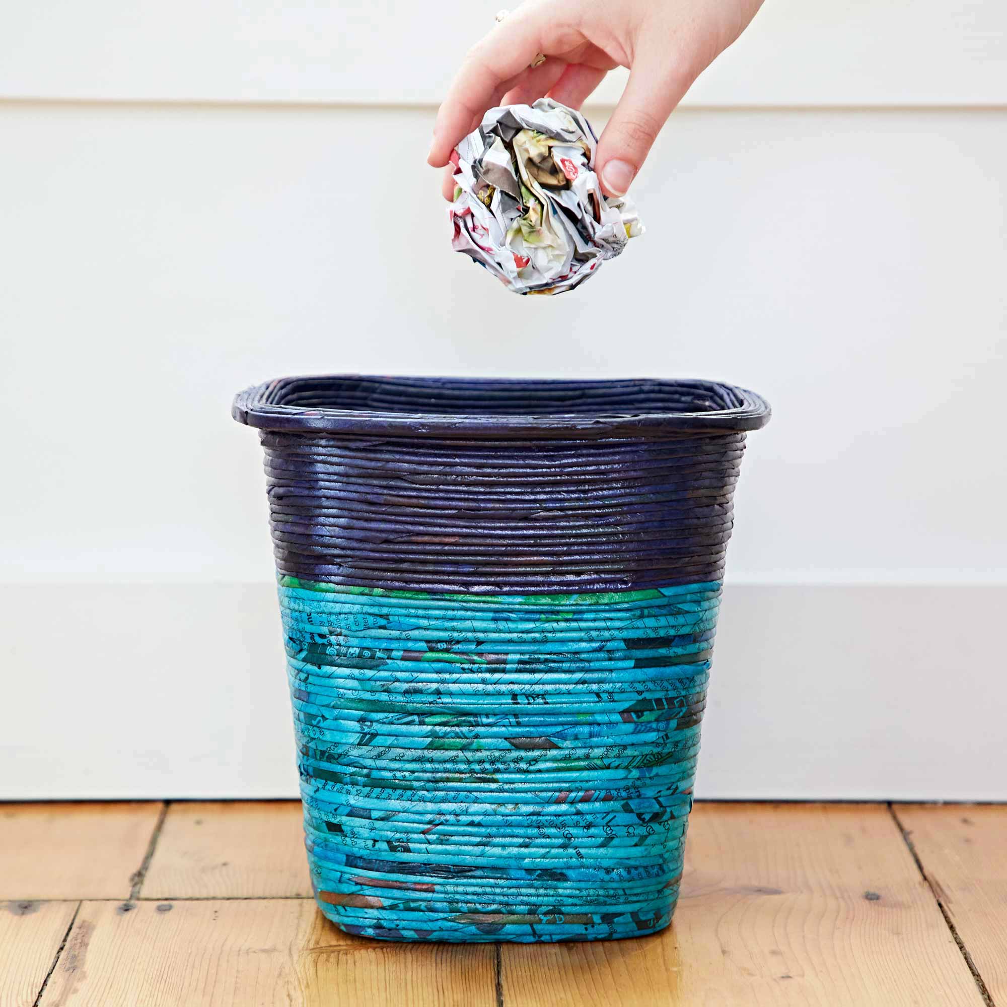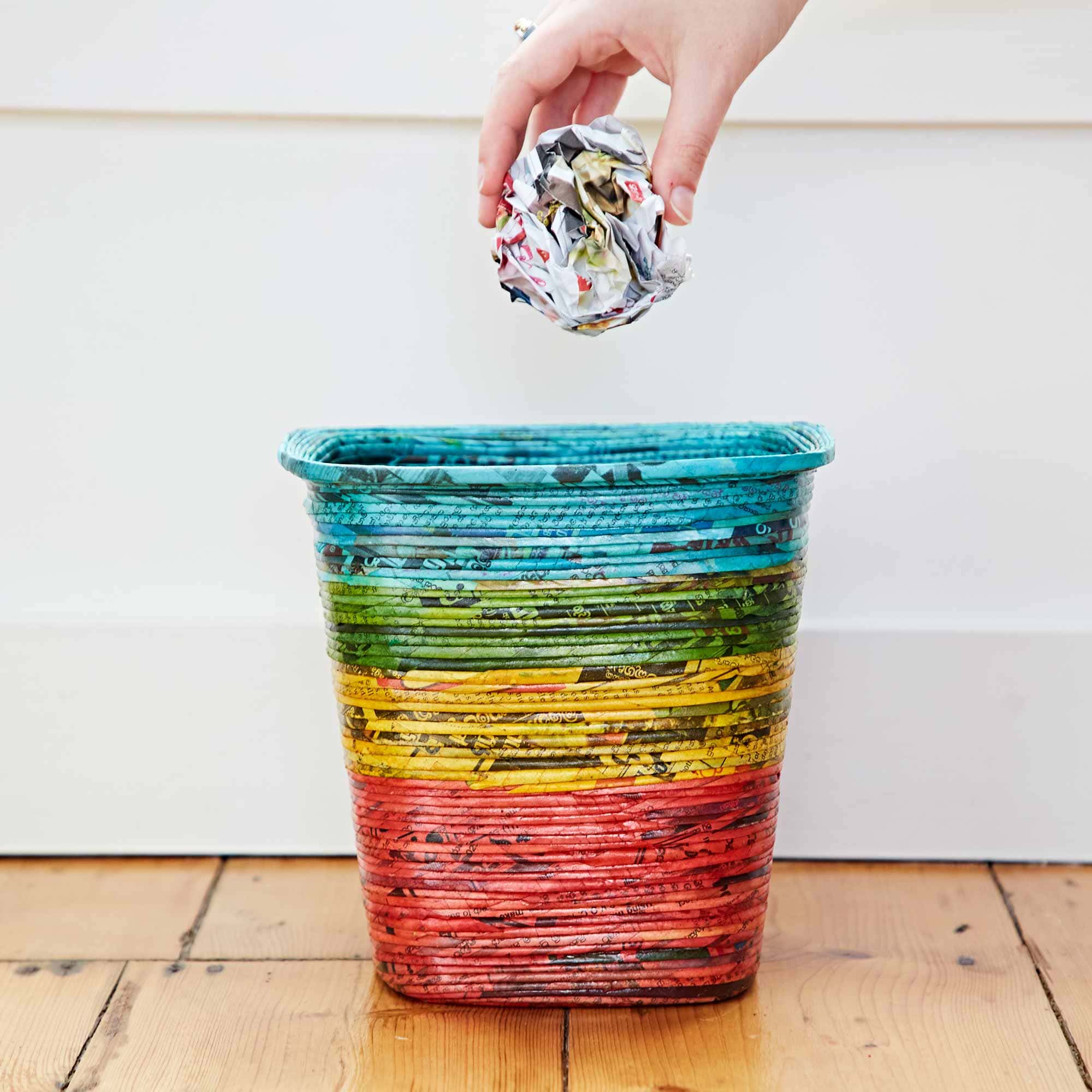These recycled newspaper waste paper baskets can be used as a waste paper bin or even for storage in your home or office. The colourful striped design is handcrafted by Fair Trade artisans, making each one unique.