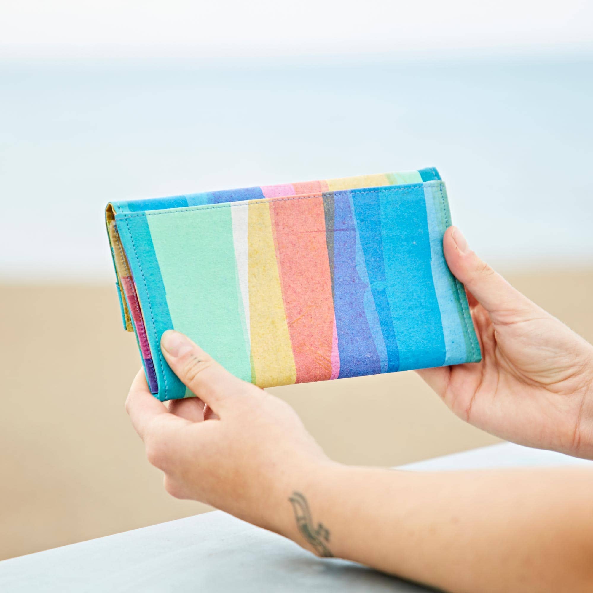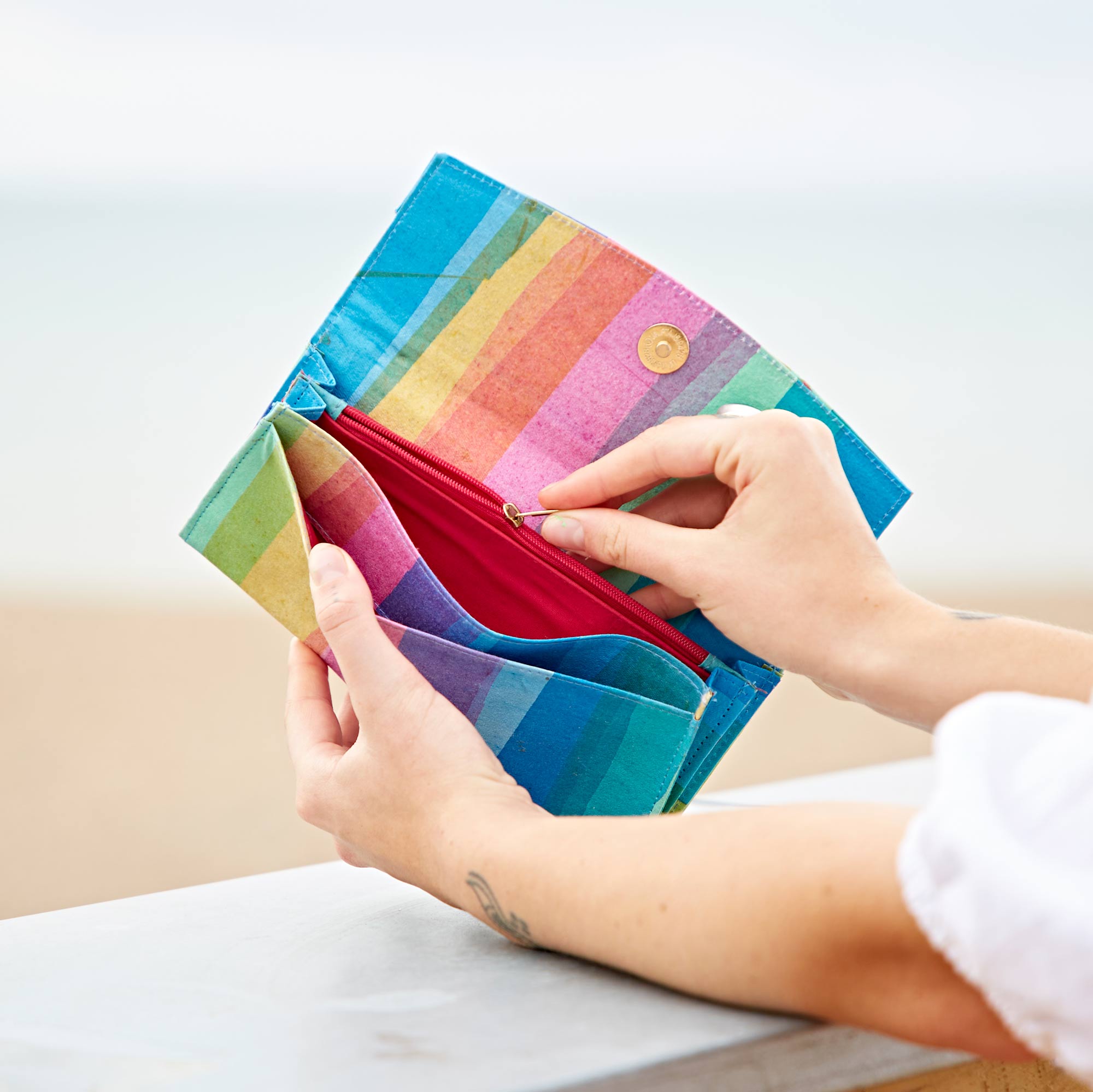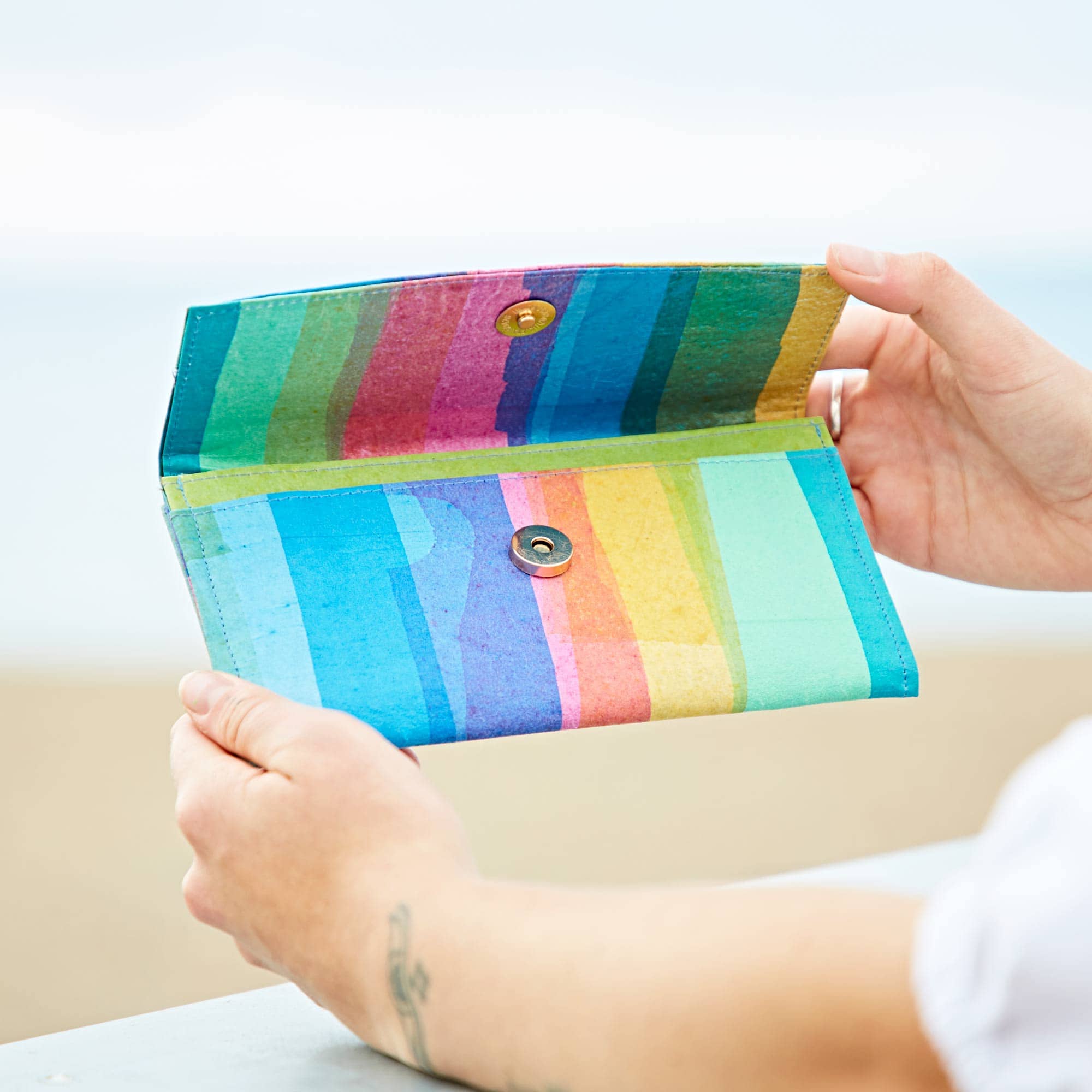 The plastic is collected and segregated by type and colour before being thoroughly washed. No dyes are added to this process, the colour and designs come purely from the layering of plastic. The plastic is then put into a machine which turns it into a durable, waterproof plastic fabric or solid sheet, ready to be made into a unique product.