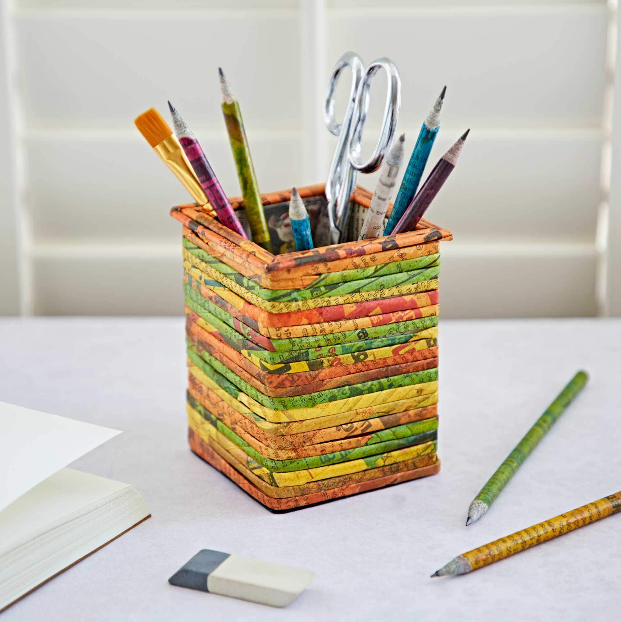 Brighten up your desk with our colourful square recycled newspaper pencil holders. Hand crafted from recycled newspaper, each piece is rolled, painted, and pieced together by Fair Trade artisans. For even more eco-friendly points, why not pop some of our recycled newspaper pencils in your pot.