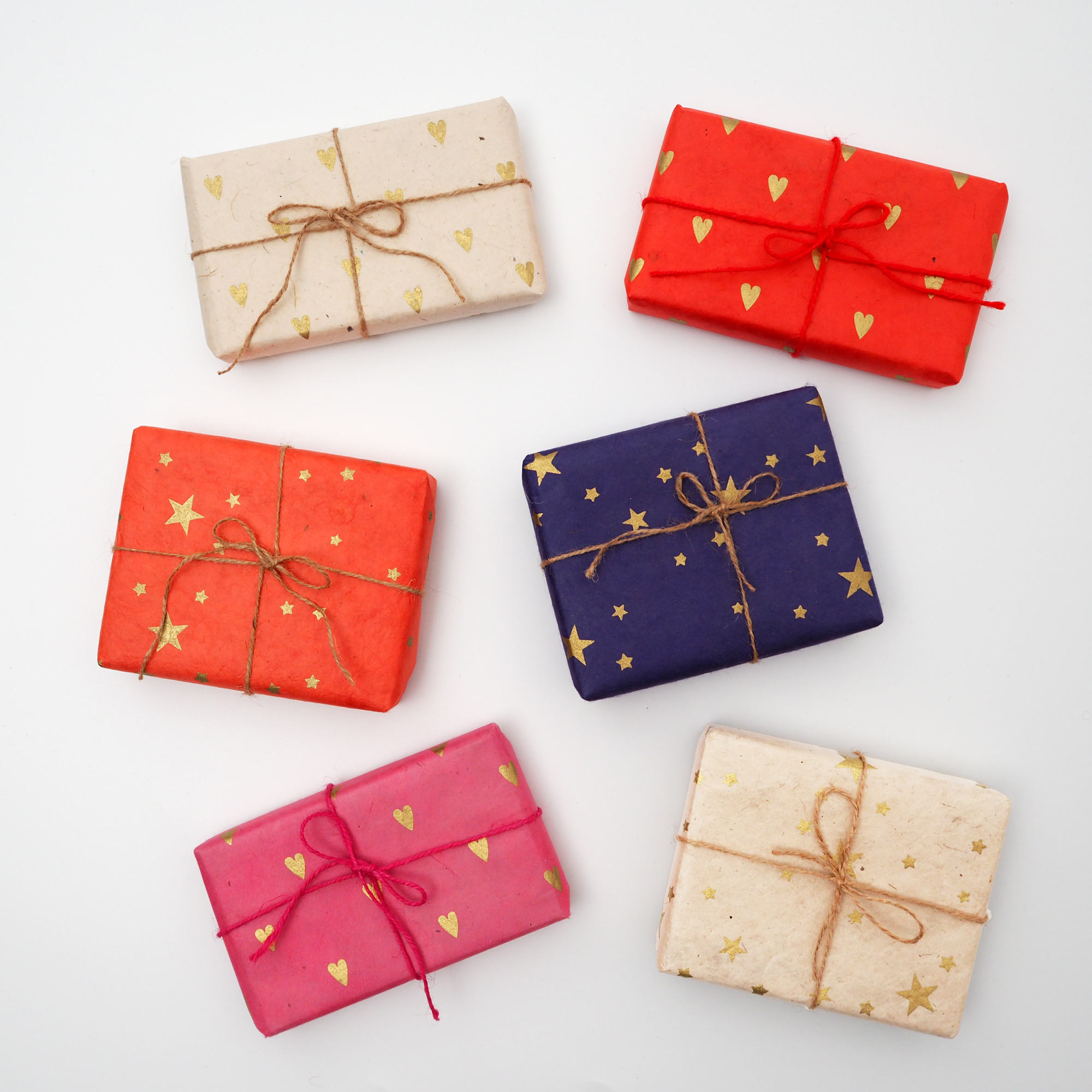 Available in a variety of colours and patterns, each sheet of Lokta paper is unique, showcasing the traditional craftsmanship of Nepalese artisans. Your gift will be carefully wrapped by hand, tied with a jute string, and finished with thoughtful attention to detail. The result is wrapping that feels both elegant and personal, turning even the simplest gift into something truly memorable.