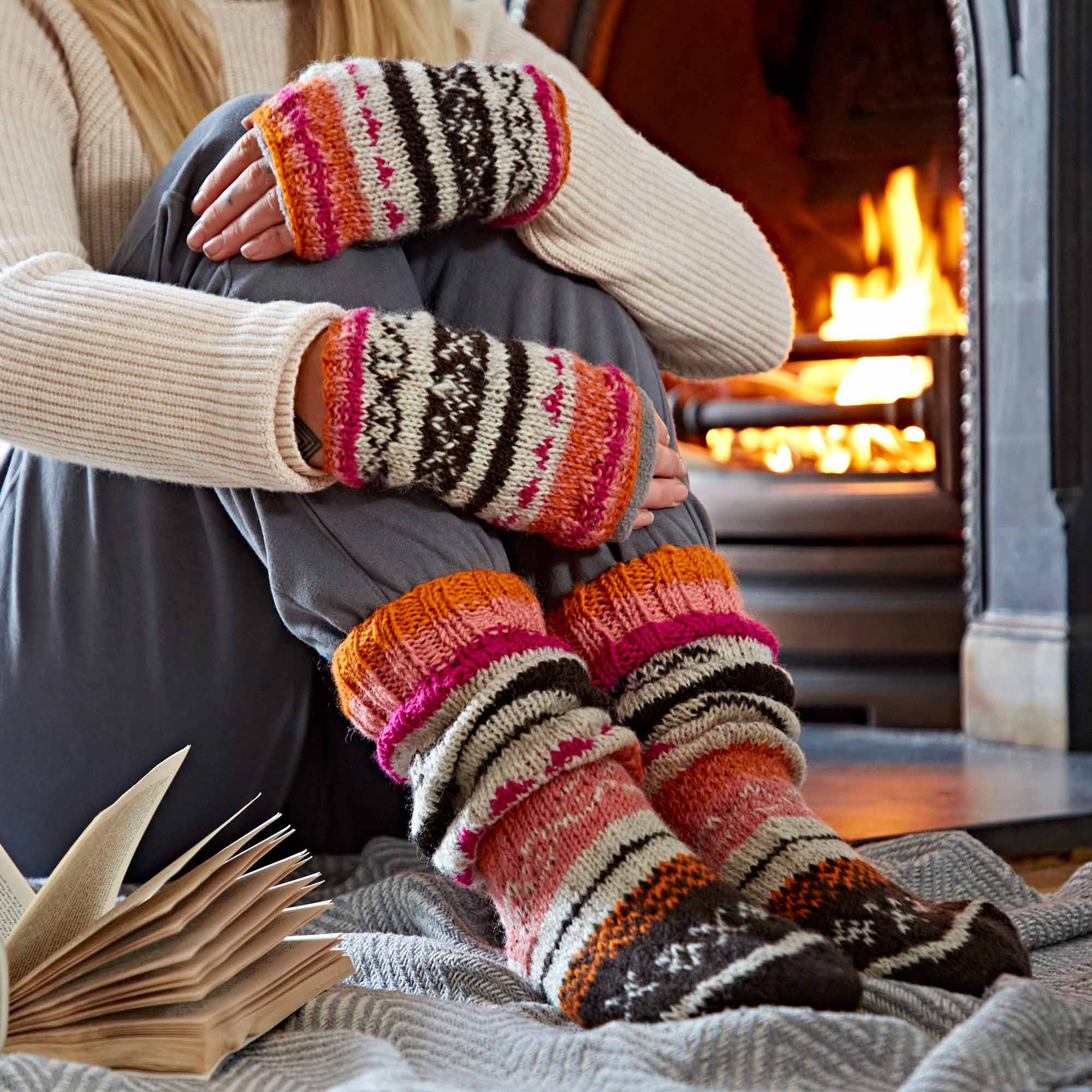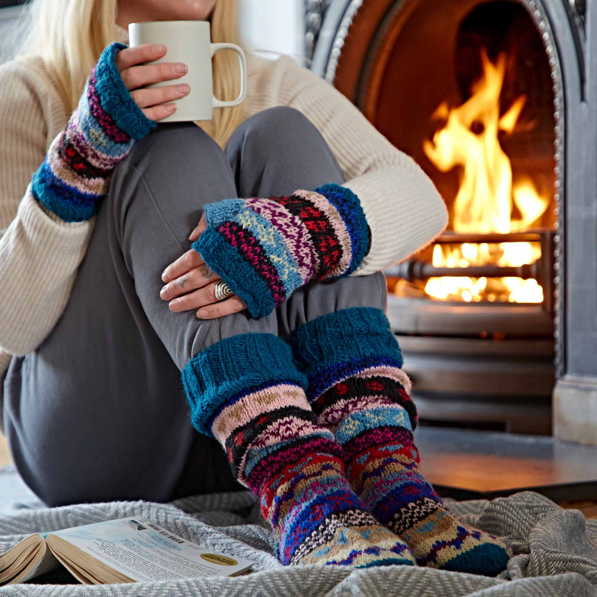 Our matching colourful woollen Fairisle handwarmer gloves and socks set has been lovingly hand knitted by Fair Trade artisans. Crafted from 100% wool to keep you cosy when the temperature drops. Our set would make a lovely Christmas present or stocking filler.